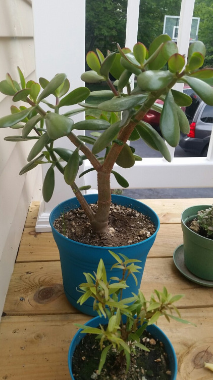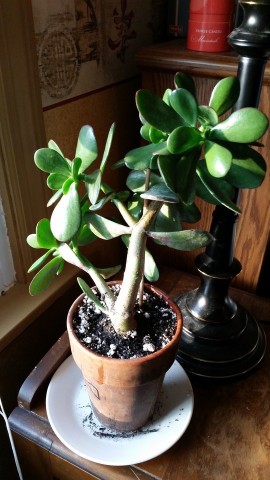 Succulent with thick, woody stems and rounded green leaves. Big Jade grows somewhat crooked with all growth on one side because of its early growth.